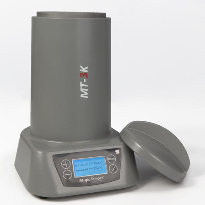 La cuve est équipée d’un couvercle avec bouclier thermique, garantissant une parfaite homogénéité des masses. Le réglage de température se fait numériquement avec une plage de +30,0 °C à +35,0 °C et une précision de 0,1 °C, éliminant tout risque de phase liquide. Les informations de régulation sont affichées sur écran LCD, pour une lecture claire et rapide.