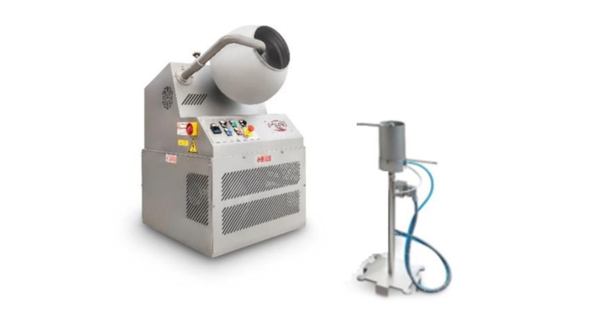 Le pulvérisateur est inclus, facilitant l'application homogène des enrobages. Le tableau électrique, avec des composants Schneider Electric et des pilotes Omron, est intégré à la structure, et le panneau de commande intuitif regroupe tous les contrôles nécessaires. Livrée avec un chariot de support à 4 roues pivotantes, la DRG-5M est également facile à déplacer.